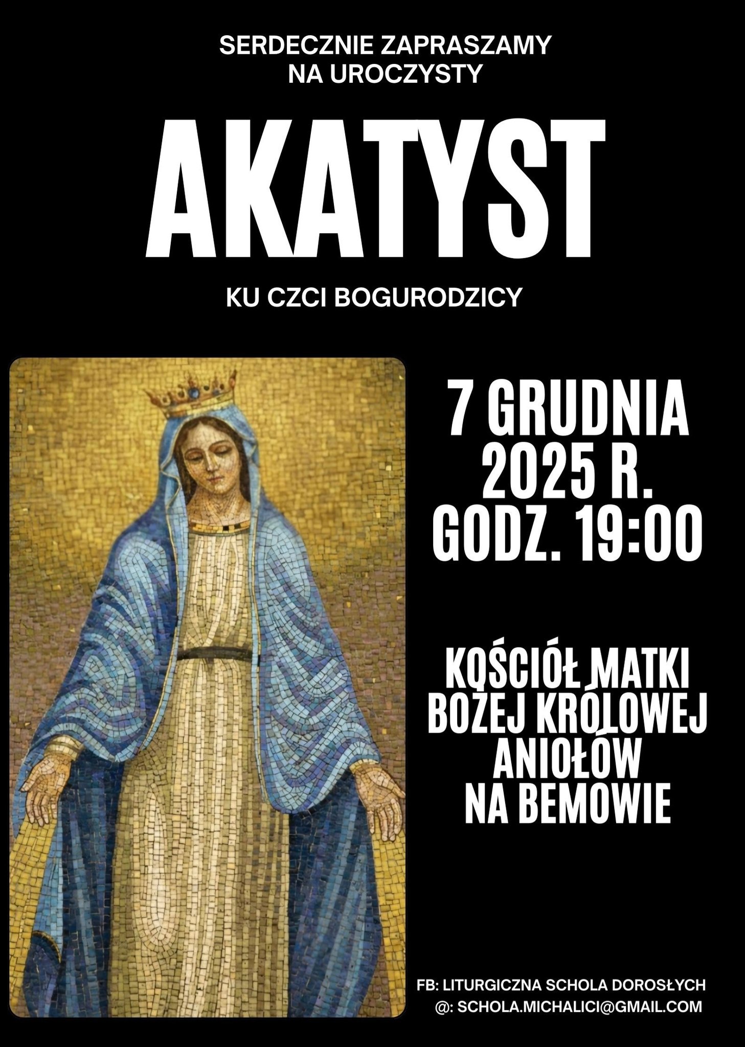 W Niedzielę 07 grudnia po Mszy św. o godz. 18.00 odbędzie się Akatyst ku czci Bogurodzicy, który jest jednym z najważniejszych dzieł w tradycji cerkiewnej. Jest to hymn liturgiczny, który oddaje hołd Matce Bożej, podkreślając jej wyjątkową rolę w historii zbawienia. Pieśń ta ma swoje korzenie w Bizancjum i jest znana jako wzorcowy akatyst. Serdecznie zapraszamy do wspólnej modlitwy wielbiącej Matkę Jezusa Chrystusa naszego Pana i Zbawiciela.