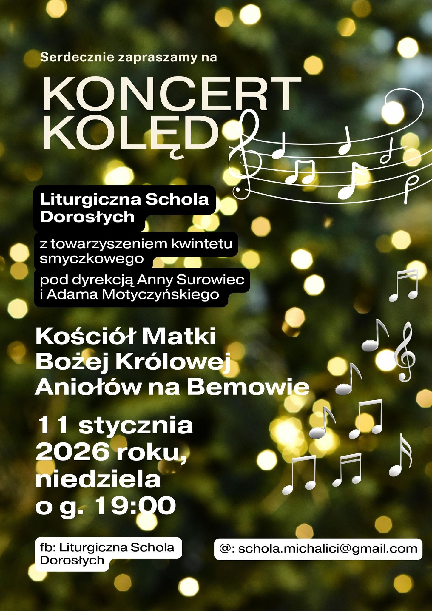 W Niedzielę 11 stycznia 2026 roku o godz. 19.00, zapraszamy na koncert kolęd w wykonaniu naszej Liturgicznej Scholi Dorosłych z towarzyszeniem kwintetu smyczkowego pod dyrekcją Anny Surowiec i Adama Motyczyńskiego.