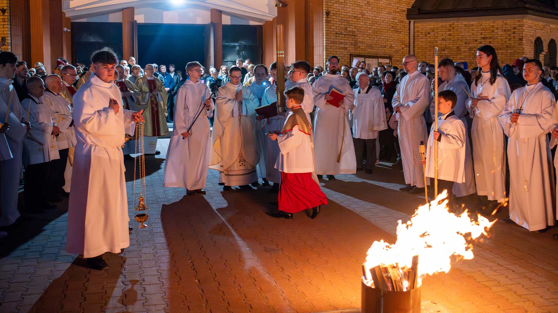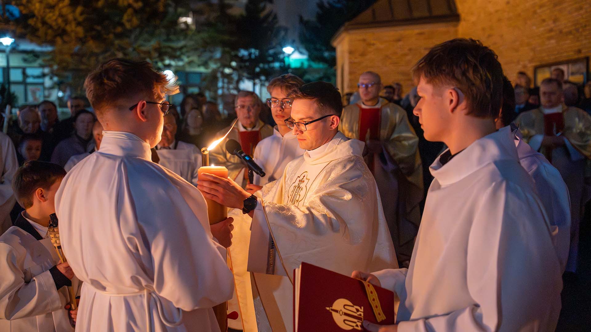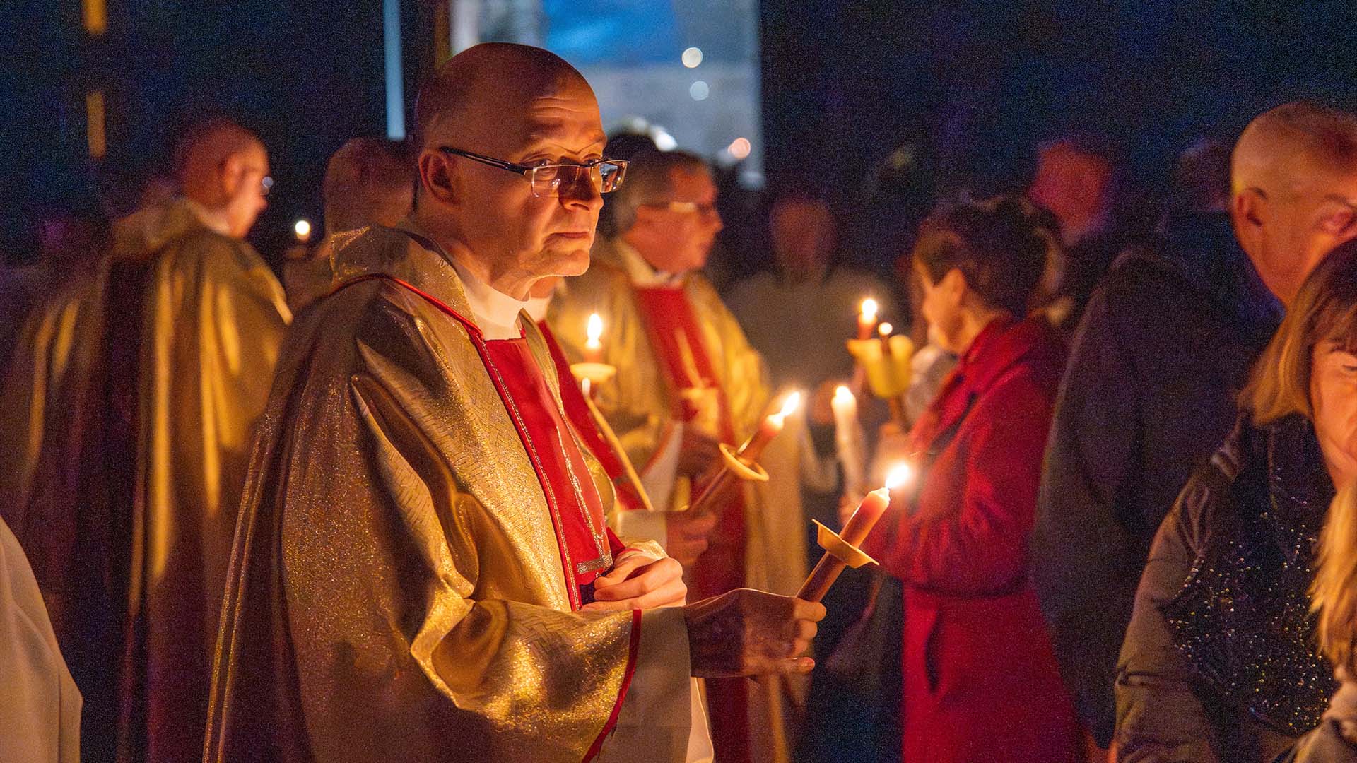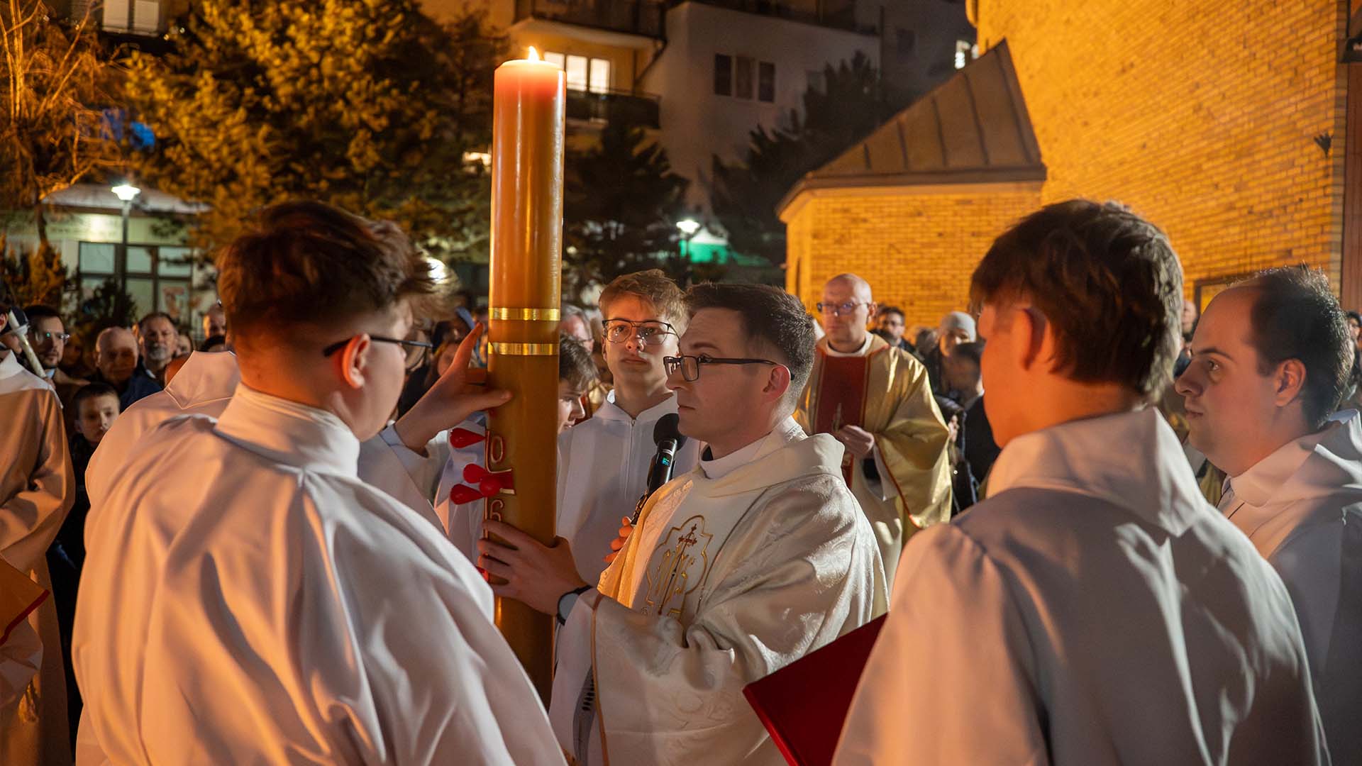 Liturgia tej nocy prowadzi nas przez cztery części: liturgię światła, słowa, chrzcielną i Eucharystii. Rozpoczniemy ją w ciszy, która jest przedłużeniem ciszy Wielkiego Piątku. Z tej ciszy narodzi się światło. Na zewnątrz świątyni zostanie poświęcony ogień, od którego zapłonie paschał – znak Chrystusa Zmartwychwstałego, światłości świata. Wchodząc za nim do ciemnego kościoła, będziemy widzieć, jak światło stopniowo rozprasza mrok. Prośmy, aby to światło oświeciło także nasze serca. Zapalając świece, przyjmijmy je jako znak wiary i jedności z Chrystusem.