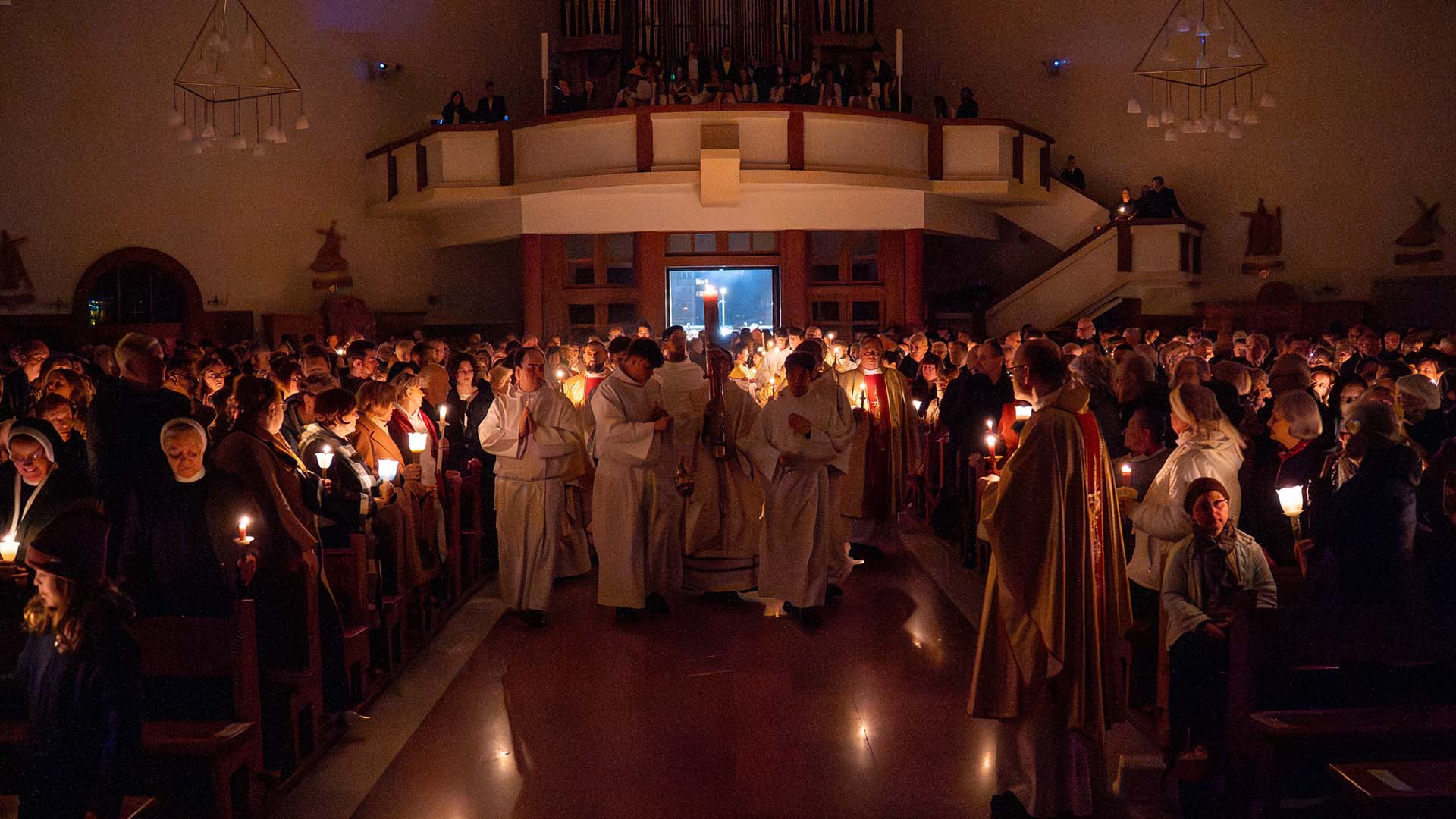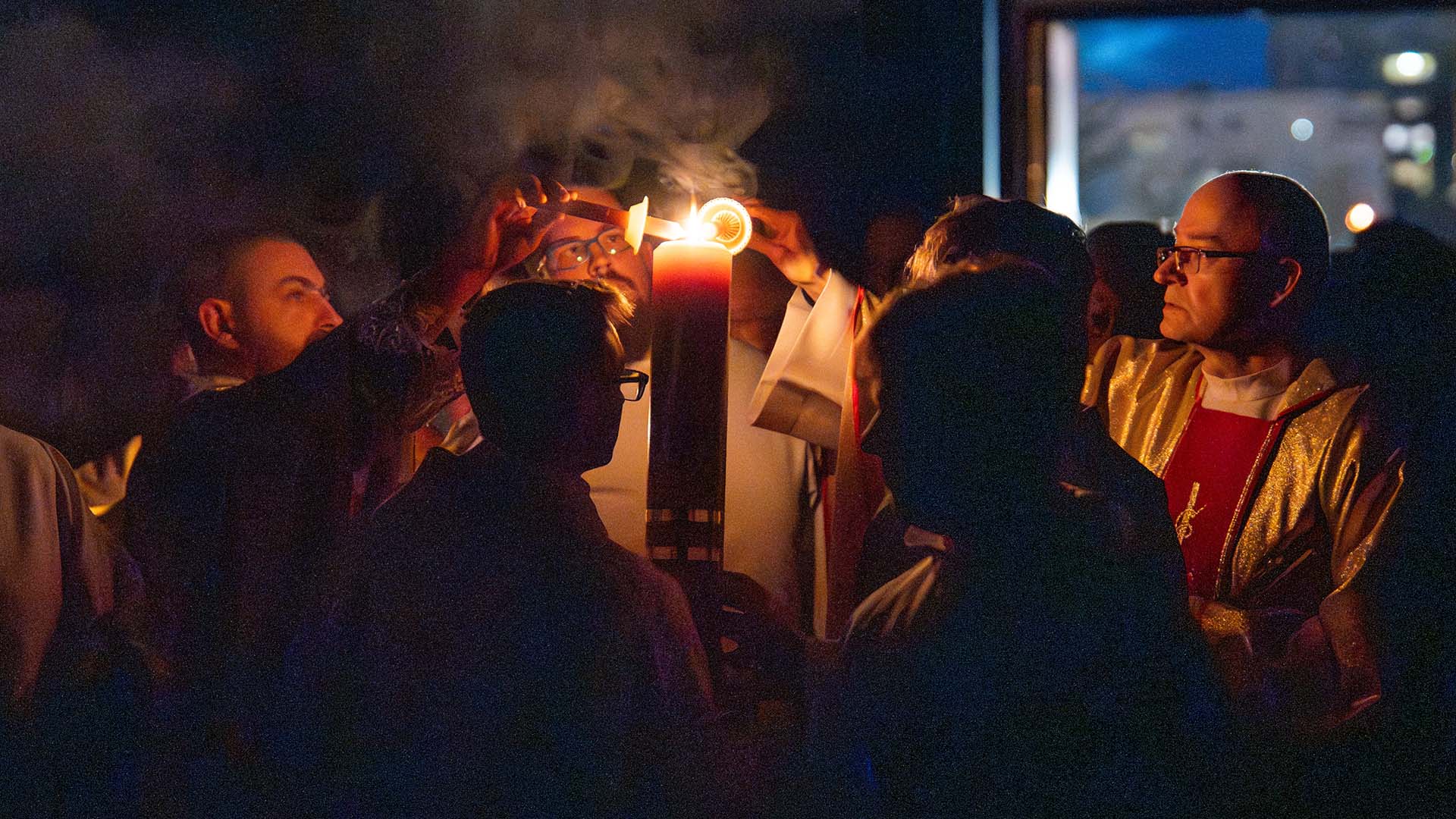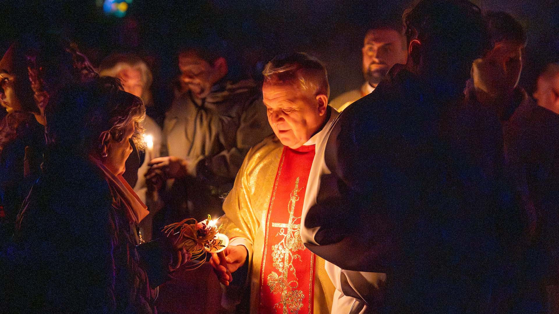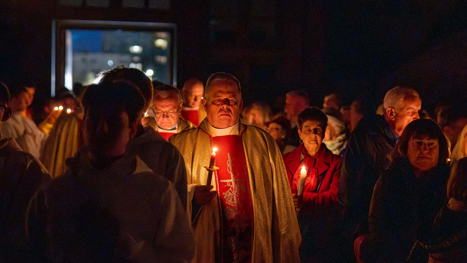 Liturgia tej nocy prowadzi nas przez cztery części: liturgię światła, słowa, chrzcielną i Eucharystii. Rozpoczniemy ją w ciszy, która jest przedłużeniem ciszy Wielkiego Piątku. Z tej ciszy narodzi się światło. Na zewnątrz świątyni zostanie poświęcony ogień, od którego zapłonie paschał – znak Chrystusa Zmartwychwstałego, światłości świata. Wchodząc za nim do ciemnego kościoła, będziemy widzieć, jak światło stopniowo rozprasza mrok. Prośmy, aby to światło oświeciło także nasze serca. Zapalając świece, przyjmijmy je jako znak wiary i jedności z Chrystusem.